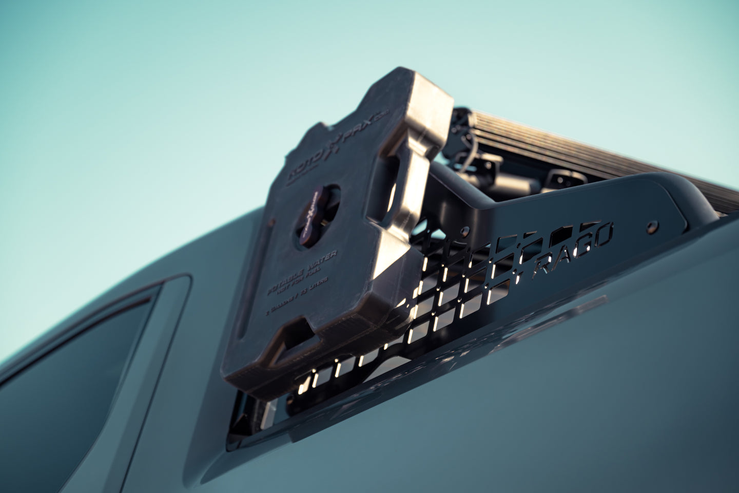 Access items stored on the chase rack from either outside or inside the truck bed. Even with a Rotopax mounted on the exterior, you can still easily mount bags, flashlights, knives, and all sorts of items on the interior!