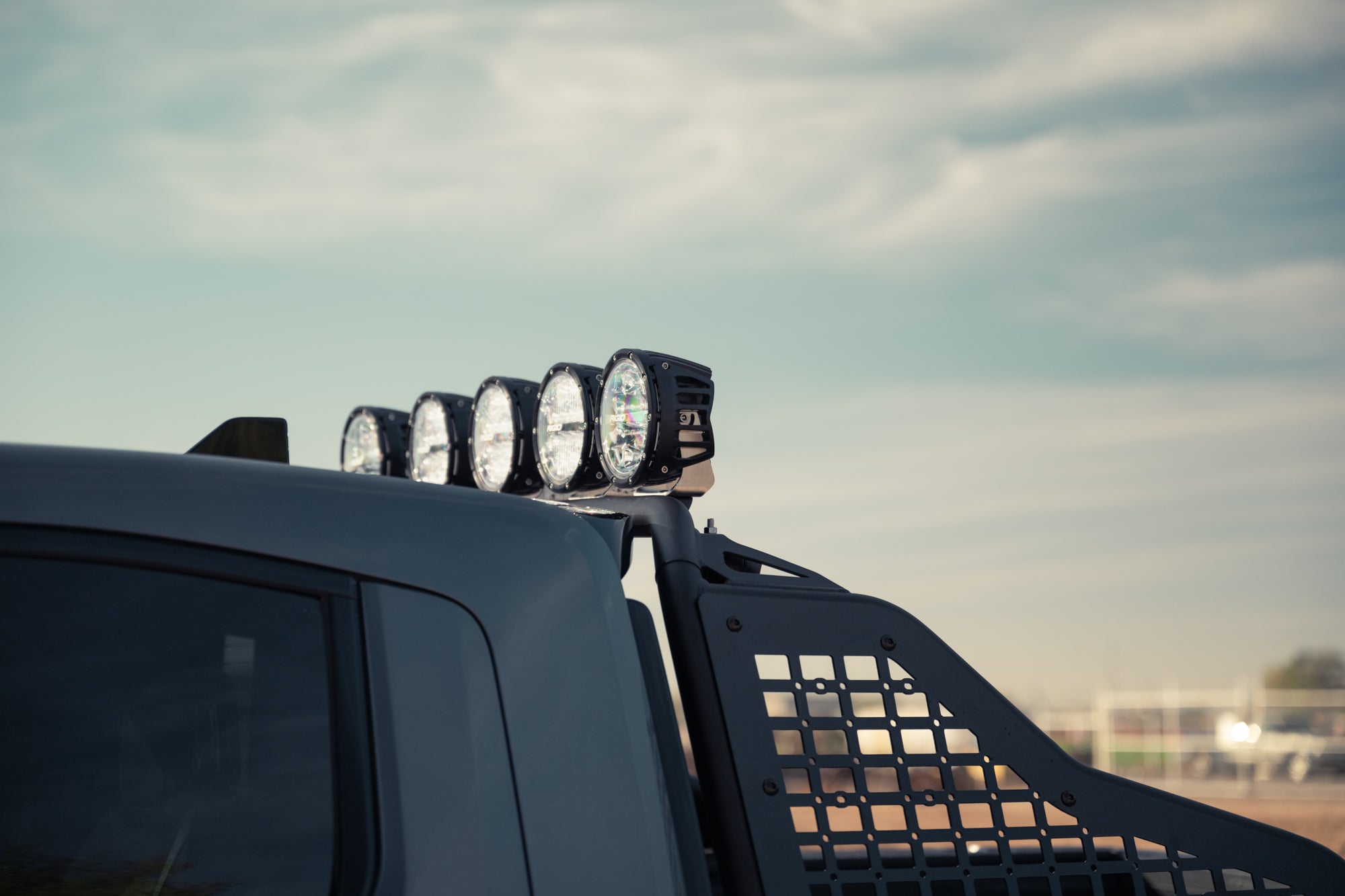 The R1T Chase Rack is designed to accommodate (1) 30” Light Bar or (5) 6” Round Lights on the top tube mounts. There is an additional pair of mounting points for pod lights to be facing out the rear of your truck bed.