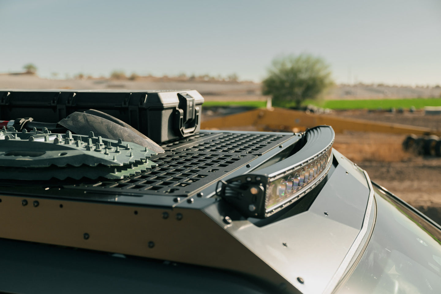 The roof rack’s low-profile fitment adds only an additional 1/4” to your Rivian’s total vehicle height from the highest OEM antenna point. Our optional Decking Panels provide a flat platform for securing larger supplies, and their molle design & L-Track mounts offer versatile mounting solutions. For additional lighting options, our RIGID Light Mount fits up to six 6-inch RIGID round lights. The rack is compatible with the factory glass roof, and it does not interfere with the OEM antenna/satellite receptions. It is made from durable and lightweight aluminum, and is finished in a sleek satin black powder coat with hammer black accents. All Rago EV products are proudly made in the USA.